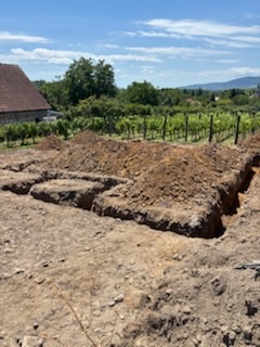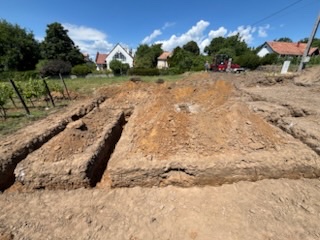 Az alapozást a geodéta kitűzése és a szükséges terepmunka előzte meg: kijelöltük a ház helyét és magassági pontjait, elvégeztük a földmunkát, előkészítettük a munkaterületet.
